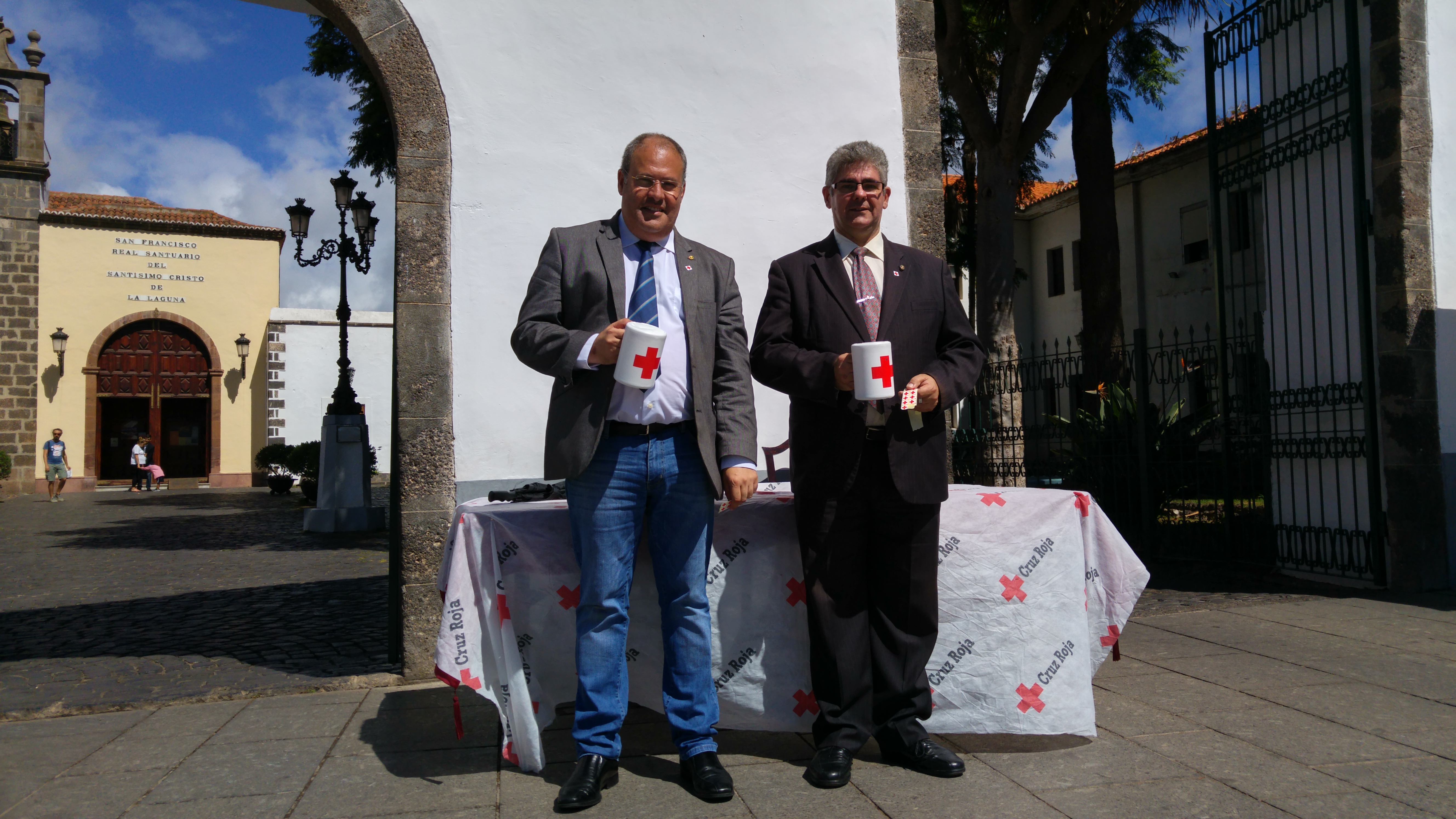 Cómo lo hace la Esclavitud del Stmo. Cristo de La Laguna que colabora con la Cruz Roja postulando con una mesa por fuera de los Arcos del Real Santuario.