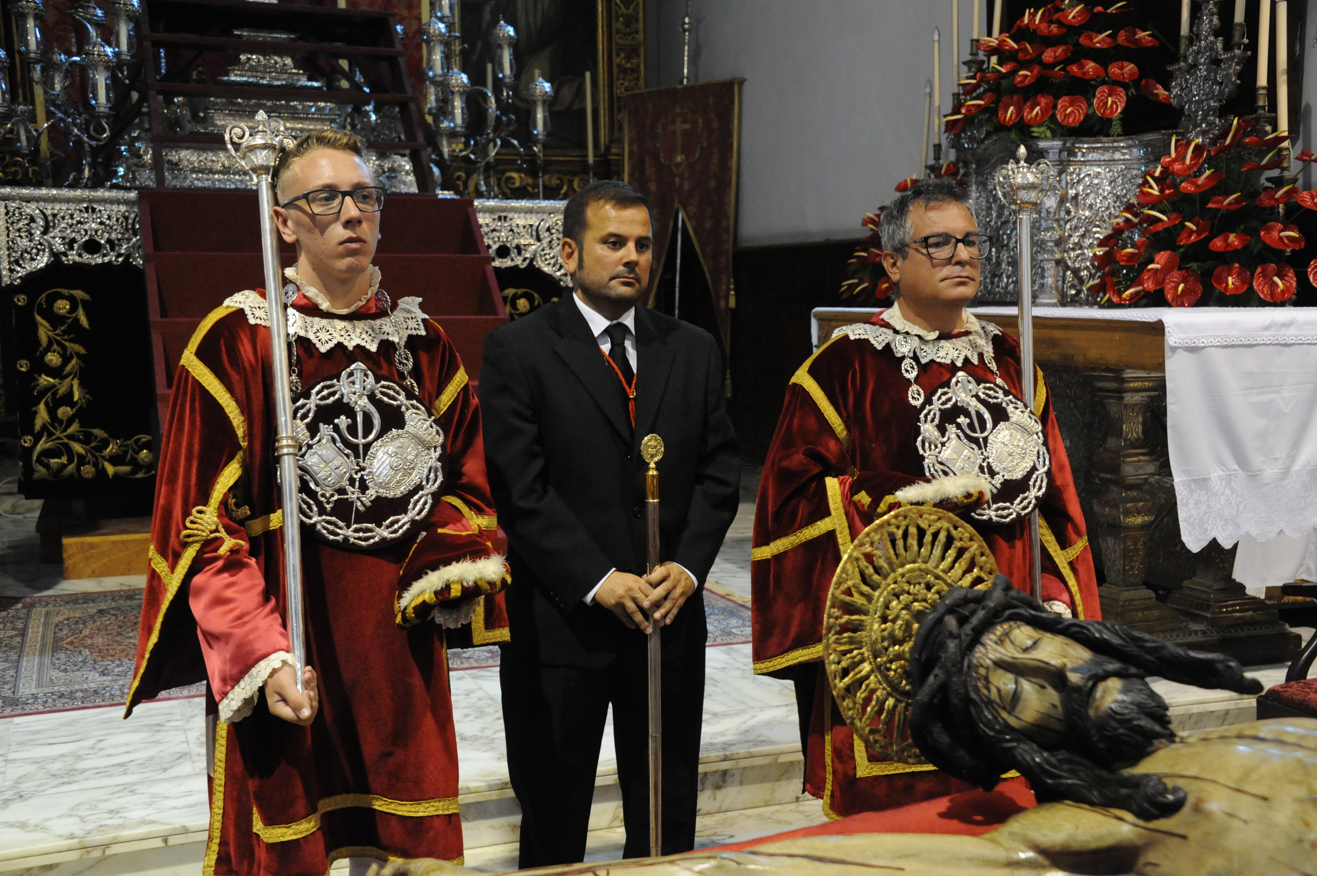 Las Varas de Maestros de Ceremonias son de plata, con el escudo de la Esclavitud con una S y un clavo entrelazados.